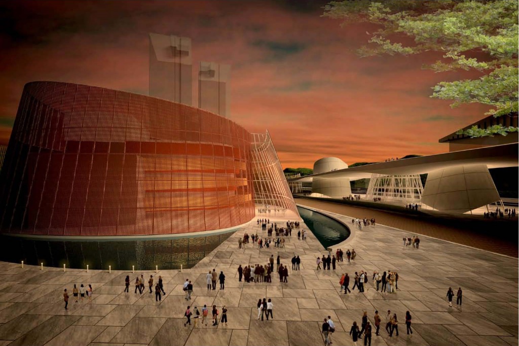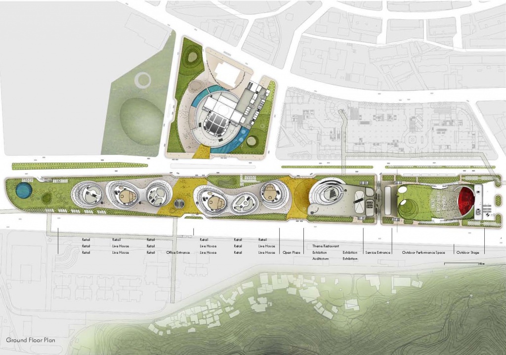 1. 將大型表演場地、名人堂及以Live House為中心的商業空間群,都視為一座座大小不一的「磁石」(attractors),吸引趨音及趨光性強的民眾漫遊其間,形成擴散狀、流動性格的磁場,產生新的市民空間—北基地被重新定位成一個主題性的「音樂公園」(music park),南基地則為「音樂市集」(music bazaar)。