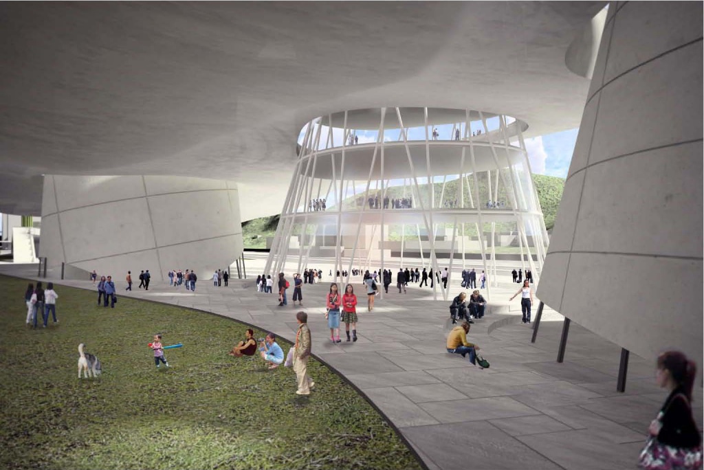 2. 將磁石固著的地面層,以「漣漪」(ripples)為概念,塑造不同尺度的表演場域(amphitheater)。由地表上掀的皮層(lifted ground),除提供都市空間良好的庇蔭外,其下方波浪般的皺摺亦形成利於音響反射的頂蓋,形成新的都市漫遊氛圍。