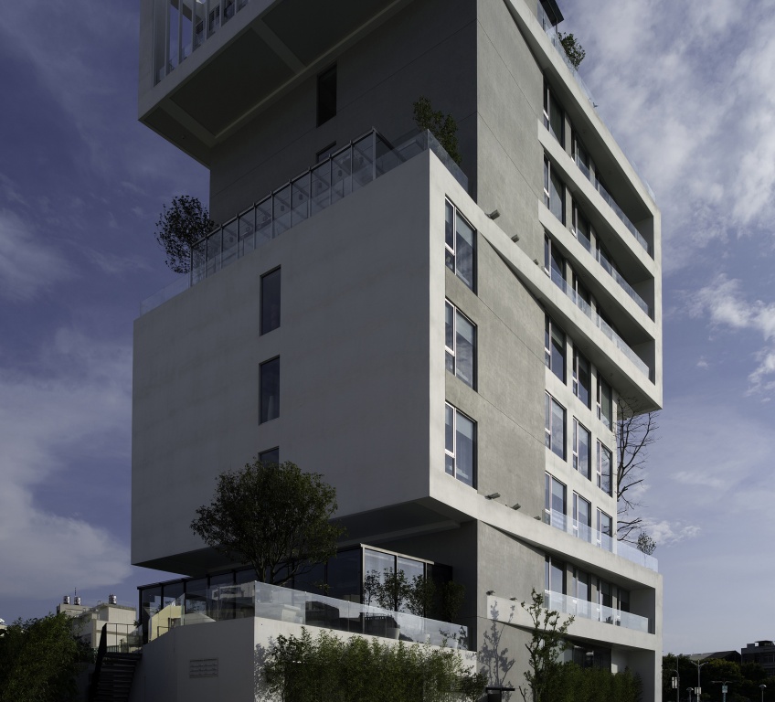 Hotel Teascape is located on an urban corner site, facing an intersection of a 90-meter-wide artery and a 10-meter-wide alley. It is a boutique hotel with a thematic experience, all features in the hotel are related to the themes -“Tea” and “Travel”. The idea of building form evolves from an image of stacked-up tea chests; every three floors are grouped as one chest, and the chests are shifted horizontally to produce terraces and cantilevered rooms. The shift in direction responds to the dynamic urban corner conditions, and the horizontally stripped balconies offer shadow and greenery to give the rooms more privacy.