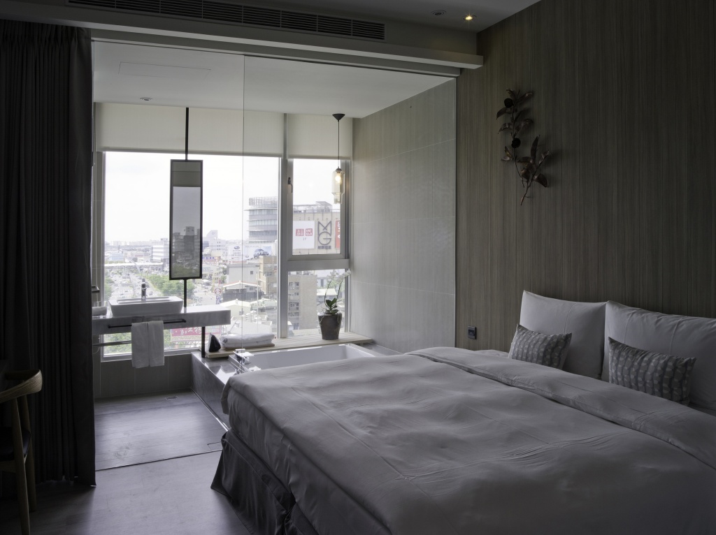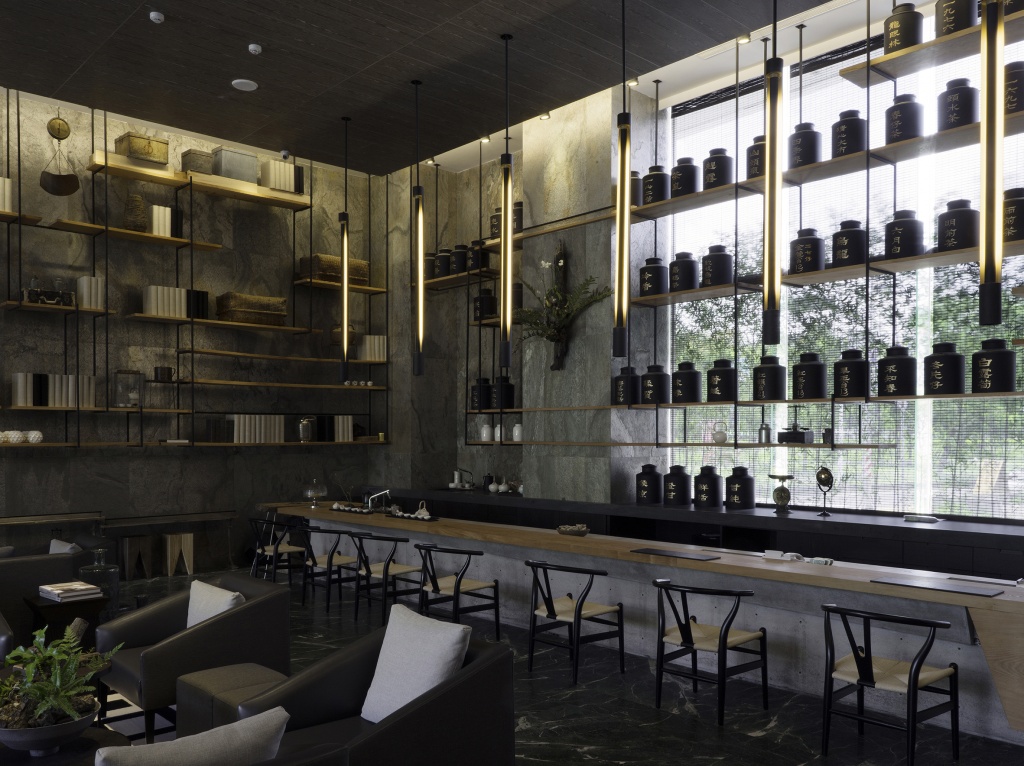 The idea of lobby design comes from traditional “Tea Feast” – a ceremony of tea tasting. So the front desk and concierge are integrated into one linear log counter, with vertical display of tea canisters. The furnishing material and decorations of guestroom design also follows the same theme. Bathing and shower area are placed on the window side, which enhances the relations of body intimacy with urban landscape.