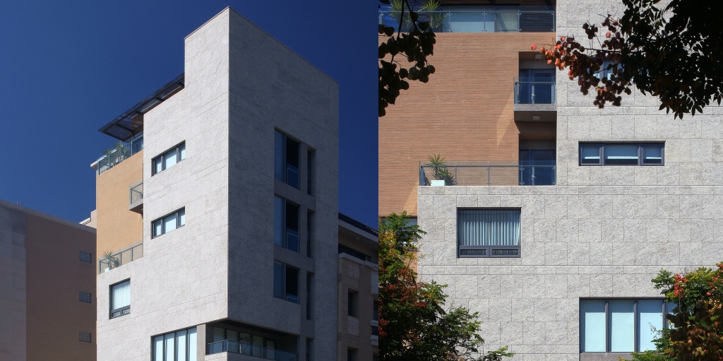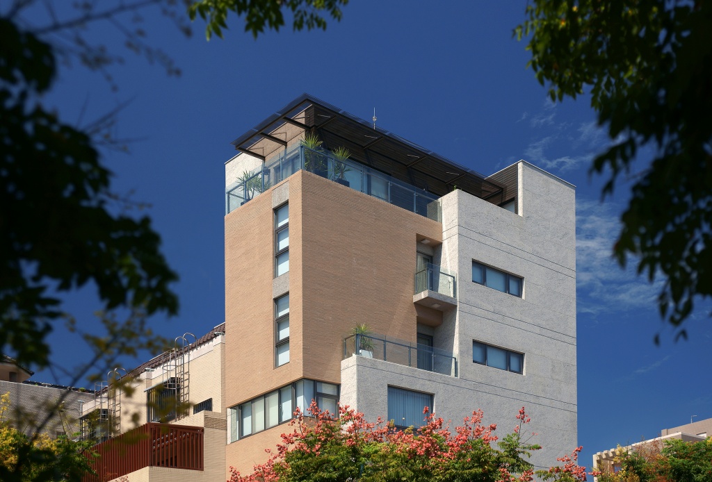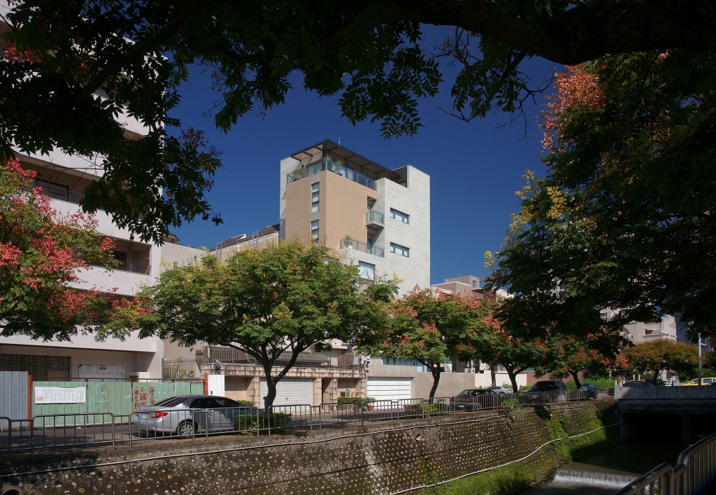 業主空間使用內容原為一家五人同住之二代同堂獨棟住宅,然在長達三年餘之設計建造過程中,新生兒的降臨將其成長成為七人同住之三代同堂住宅,在極有限的單層建築面積及整體使用面積考量下,垂直化的分層分戶似乎是唯一的選擇。如何在剖面上促成室內外及上下層間的流通感,同時保持各戶的私密空間,形成有「居住感」的空間,是首要的挑戰。另一個外在的挑戰則是如何在單調的高層箱型量體上,刻鑿出屬於「住宅」而不是「公寓」的表情。因此,一般在集合住宅建案中比較沒有受到公平待遇及重視的雨遮、陽台、露台、花台以及玄關等空間,在本案發揮起了重要的作用。底層的金屬雨遮延伸了客廳與前側院的視覺框景,如同「簷」的效果,頂樓的玻璃雨遮則界定了工作/休閒陽台的虛體範圍。五樓及六樓單獨出挑的小陽台,則在大而平坦的東向立面上,相對地透露出個人化的小尺度。