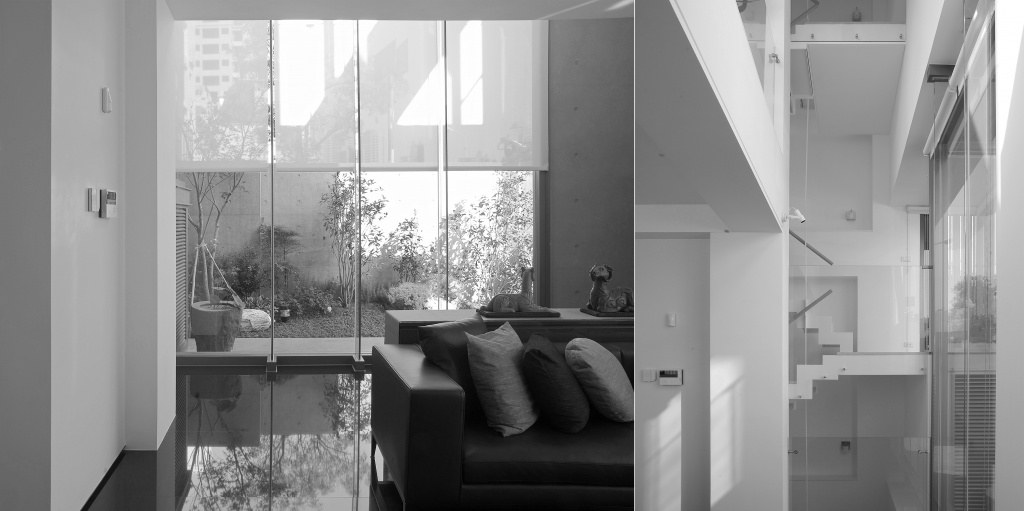 玄關上方的長條狀挑空在剖面上,與二樓餐廳上方的完整挑高空間形成了梯階狀的連續虛空間,將北向庭園綠意藉由落地玻璃引入室內,並且連串起三樓Gallery、二樓廚餐廳,以及一樓的客廳的公共區域。狹長挑高的玄關不再只是功能性的脫衣換鞋空間,而是一個提供「居住感」的室內外虛空間的交會處,玄關端點的樓梯間,則利用鋼梯及扶手輕巧且透空的構造,將視覺向上方延伸,彌補並擴大原本單層面積不大的空間感。