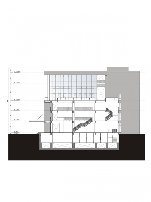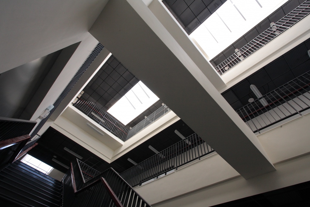 3. “Connection” – “Voids” are used to link large blocks: the largest void is placed between large open offices and independent single offices, and forms a 3-story-tall atrium. The ground level of atrium is connected with entrance plaza, so it becomes a “mall” for people to interact with policemen. The horizontal void on the 2nd to 3rd floor also acts as a “wind tunnel” of this building’s micro-climate. The big window-less opening on the south-west corner allows summer breeze to flow through, and lower down the interior temperature to minimize the air-conditioned capacity.