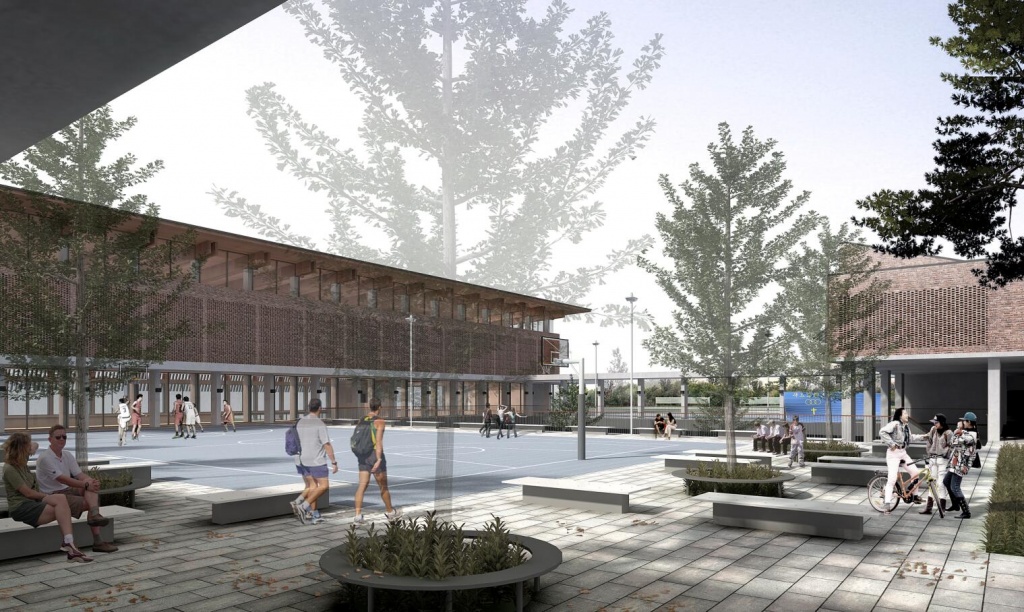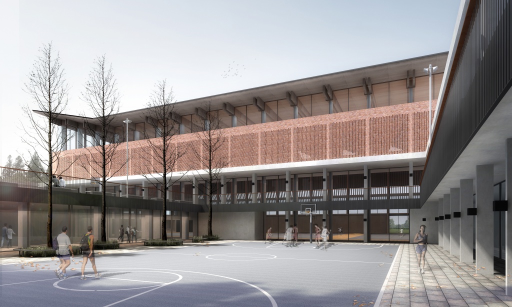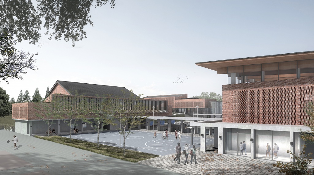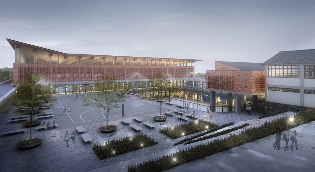 The tectonic elements of all building envelopes derive from existing campus buildings, with a contemporary twist by articulating the dialectic relationships of structure and ornament, such as the double-wall system with the patterned brick as rain screen on the outer layer. Most structural systems are post-and-beam reinforced concrete, the roof structure of the basketball center uses pre-stressed string beam system of laminated wood and steel cable and bars to reduce the construction time, also to give an expression of lightness for the 40-meter-long span. The underground badminton courts use the folded concrete plate system to isolated the space from the impact noise form the outdoor basketball fields above. The genius loci of Tunghai University is what we try to retrieve and to revive in the project. Our attempt is to create a space with spirits and campus activities, not another monumental landmark building.