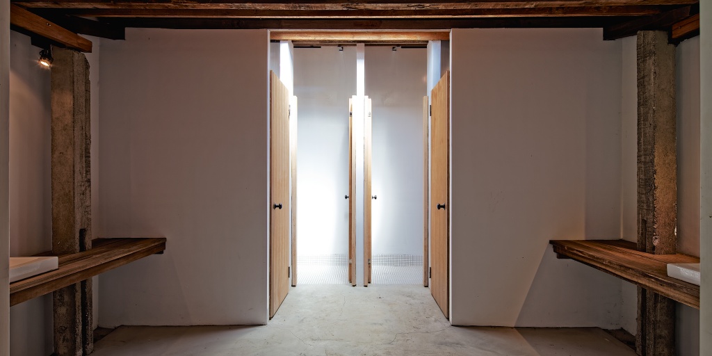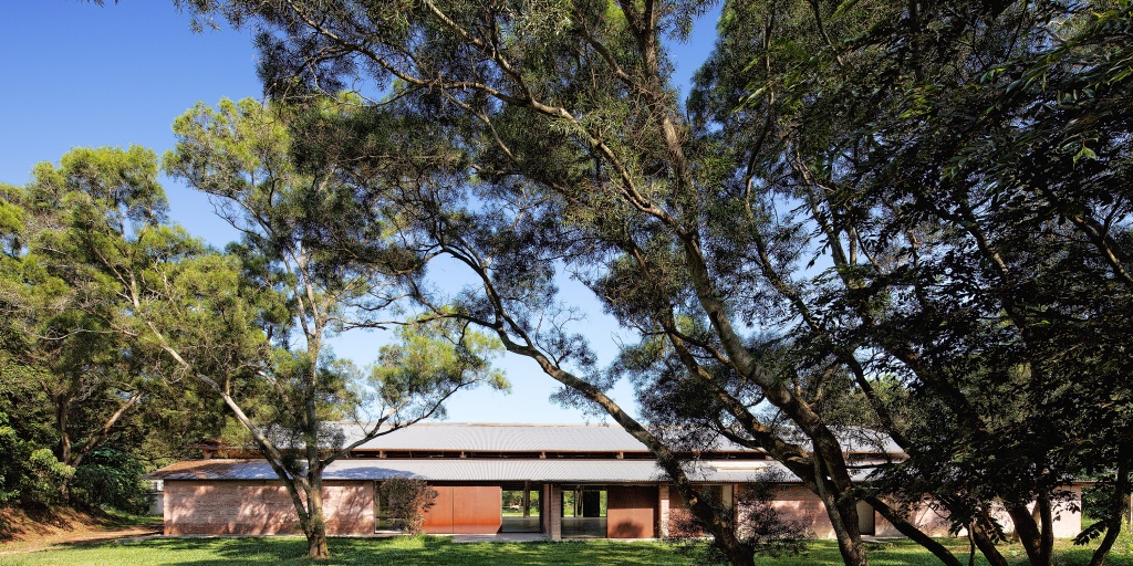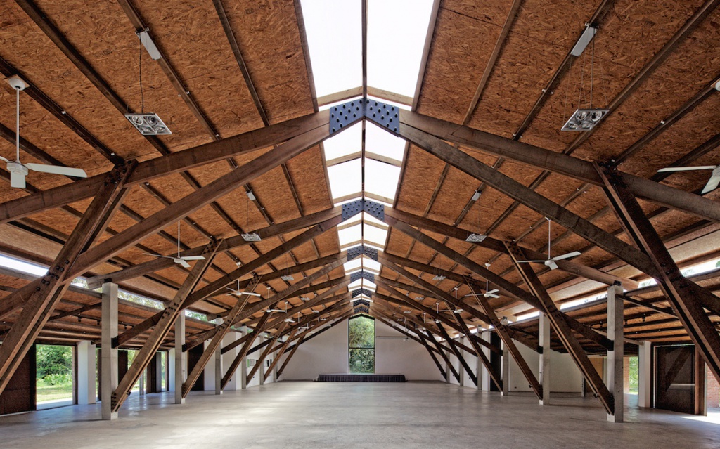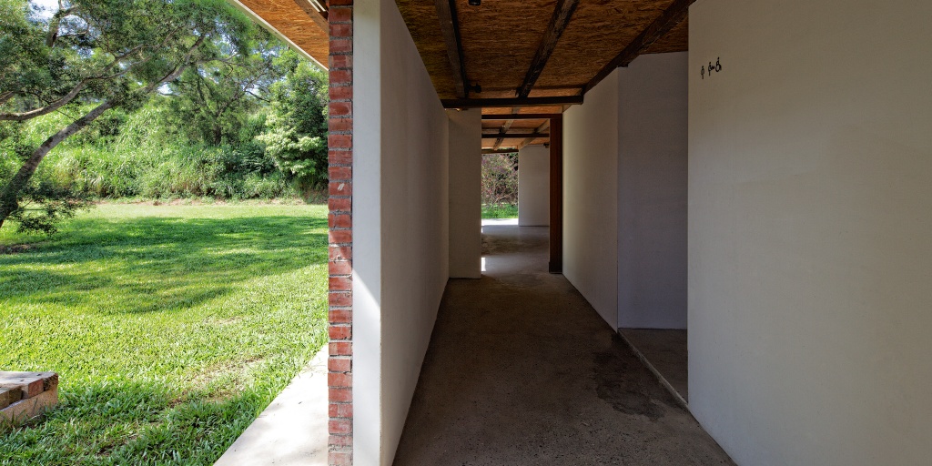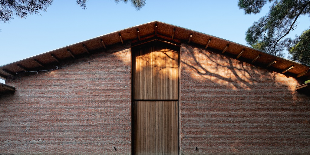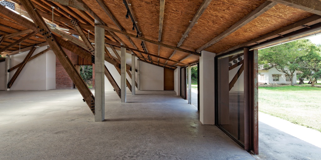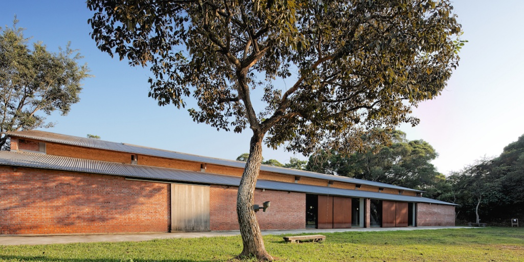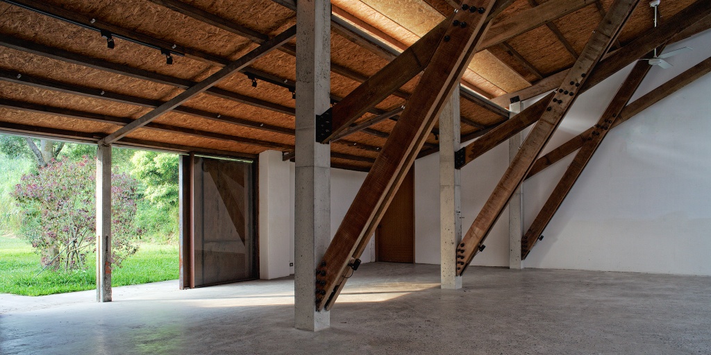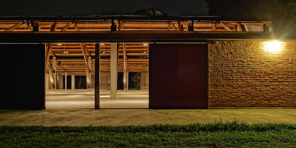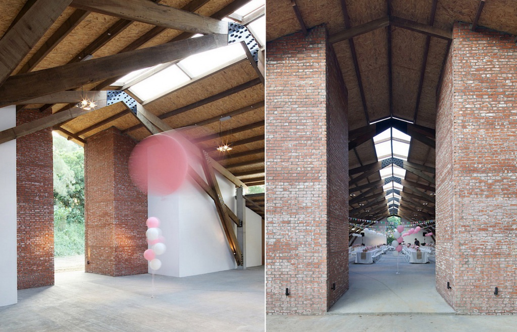 基地位於八卦山麓,牧場原畜產功能的屋架依地勢羅列,在1985年前後適逢續產業低彌荒棄使用。2013年業主構思以穀倉為概念發展成一新架構供大型半戶外活動使用。原10x10cm的預鑄細水泥柱陣列排滿寬8.2m長40m的長軸空間本身已具美感,在基地踏勘數次後測量出偏位最小的2幢相鄰架構作為基地,各自拆除一半,中央植入新設計的清水混凝土柱搭接舊建築。新空間的形成由舊建築剖面延伸而上,由最低矮的紅磚屋簷側2.2m人體尺度,攀升至中央寬達13m的高6.5m空間。新空間的形成源自舊建築的結構旨趣和穀倉的想像,其中看似自由的各向開口擁有各自機能和框景的定義。在此極經濟的架構和牆面材質應用探索了最基本的建築問題-場所感,遮蔽,和構造的和諧。
